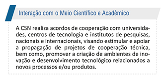 Com a captação de recursos financeiros em órgãos públicos e privados, a área de Inovação da CSN já beneficia toda a cadeia produtiva; conecta a empresa ao ambiente de desenvolvimento tecnológico e científico, nacional e internacional e cria oportunidades de inovações que geram valor agregado à Companhia, clientes e fornecedores.
